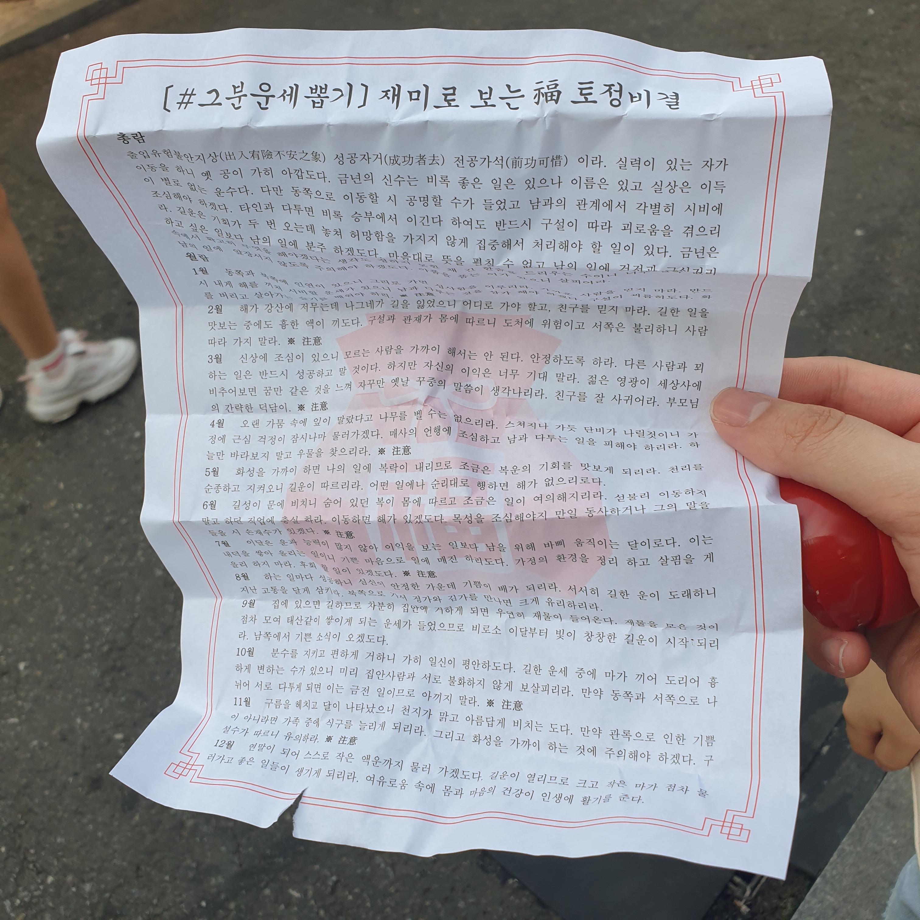 그리고 나온 점괘가 적힌 종이에는 전체 운세와 월별 운세가 나와있었다. 작은 종이에 빽빽하게 운세가 적혀있다. 혹시 궁금해서 천원 투자하려는 분들은 이거보고 궁금증을 조금 참아보는건 어떨까? 돈은 소중하다.